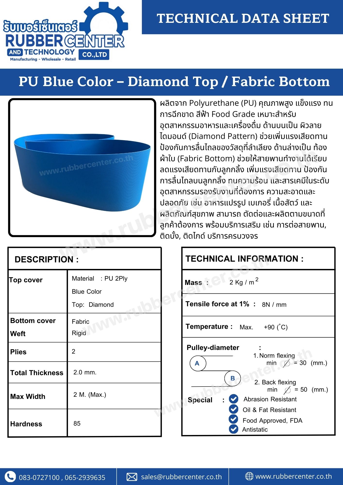 ผลิตจาก Polyurethane (PU) คุณภาพสูง แข็งแรง ทนการฉีกขาด สีฟ้า Food Grade เหมาะสำหรับอุตสาหกรรมอาหารและเครื่องดื่ม ด้านบนเป็น ผิวลายไดมอนด์ (Diamond Pattern) ช่วยเพิ่มแรงเสียดทาน ป้องกันการลื่นไถลของวัสดุที่ลำเลียง ด้านล่างเป็น ท้องผ้าใบ (Fabric Bottom) ช่วยให้สายพานทำงานได้เรียบ ลดแรงเสียดทานกับลูกกลิ้ง เพิ่มแรงเสียดทาน ป้องกันการลื่นไถลบนลูกกลิ้ง ทนความร้อน และสารเคมีในระดับอุตสาหกรรมรองรับงานที่ต้องการ ความสะอาดและปลอดภัย เช่น อาหารแปรรูป เบเกอรี่ เนื้อสัตว์ และผลิตภัณฑ์สุขภาพ สามารถ ตัดต่อและผลิตตามขนาดที่ลูกค้าต้องการ พร้อมบริการเสริม เช่น การต่อสายพาน, ติดบั้ง, ติดไกด์ บริการครบวงจร