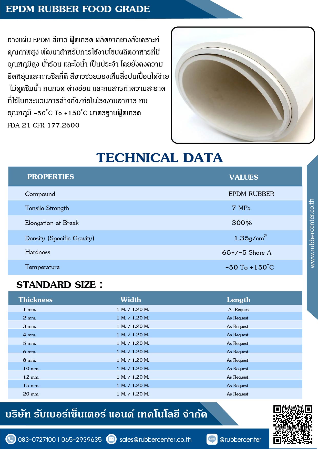 ยางแผ่น EPDM สีขาว ฟู้ดเกรด ผลิตจากยางสังเคราะห์ คุณภาพสูง พัฒนาสำหรับการใช้งานโซนผลิตอาหารที่มี อุณหภูมิสูง น้ำร้อน และไอน้ำ เป็นประจำ โดยยังคงความยืดหยุ่นและการซีลที่ดี สีขาวช่วยมองเห็นสิ่งปนเปื้อนได้ง่าย ไม่ดูดซึมน้ำ ทนกรด‑ด่างอ่อน และทนสารทำความสะอาดที่ใช้ในกระบวนการล้างถัง/ท่อในโรงงานอาหาร ทนอุณหภูมิ -50 ํC To +150 ํC ยินดีให้คำปรึกษา และให้คำแนะนำการใช้งานโดยผู้เชี่ยวชาญด้านยางโดยตรง