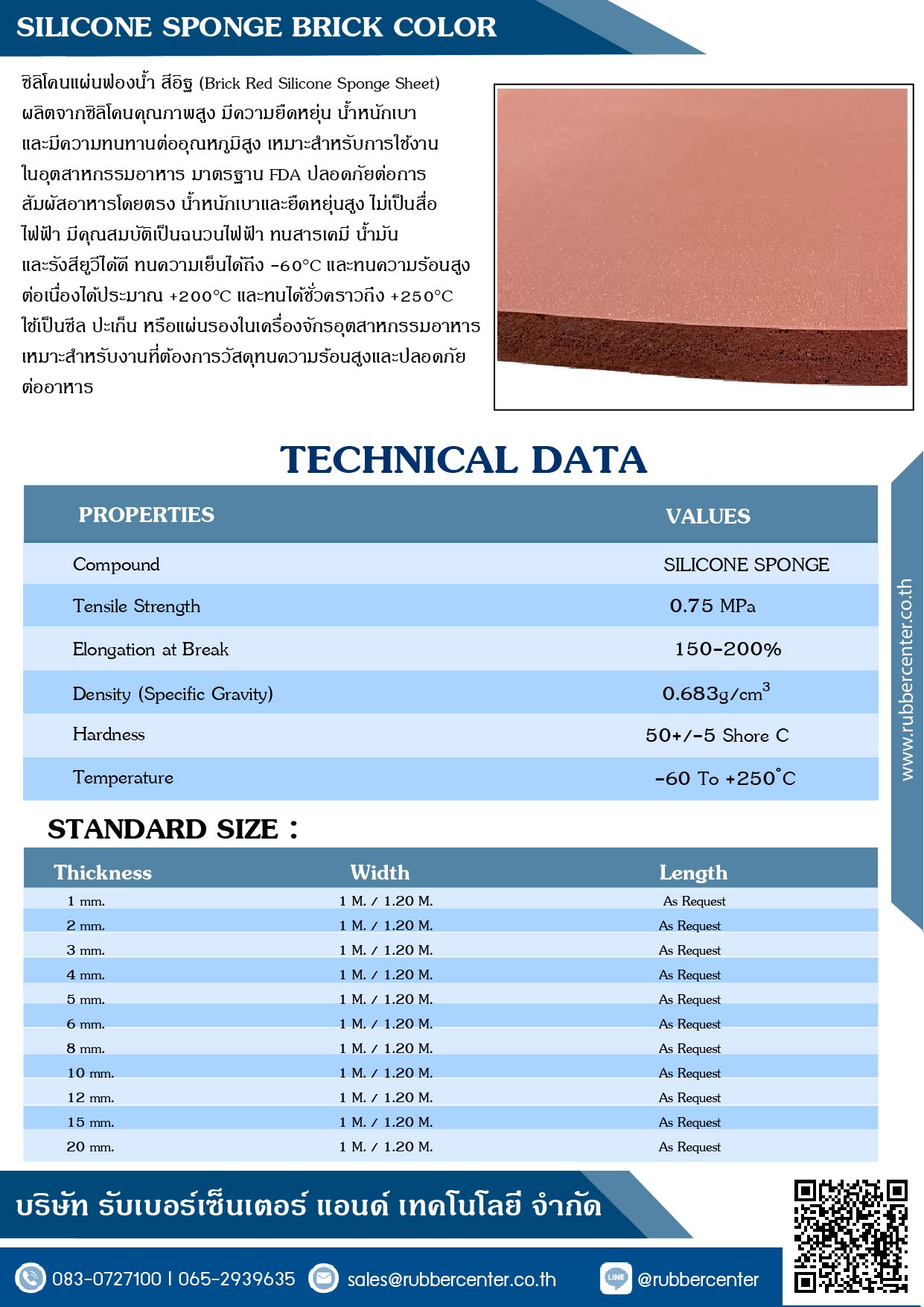 ซิลิโคนแผ่นฟองน้ำ สีอิฐ (Brick Red Silicone Sponge Sheet) ผลิตจากซิลิโคนคุณภาพสูง มีความยืดหยุ่น น้ำหนักเบา และมีความทนทานต่ออุณหภูมิสูง เหมาะสำหรับการใช้งานในอุตสาหกรรมอาหาร มาตรฐาน FDA ปลอดภัยต่อการสัมผัสอาหารโดยตรง น้ำหนักเบาและยืดหยุ่นสูง ไม่เป็นสื่อไฟฟ้า มีคุณสมบัติเป็นฉนวนไฟฟ้า ทนสารเคมี น้ำมัน และรังสียูวีได้ดี ทนความเย็นได้ถึง -60°C และทนความร้อนสูงต่อเนื่องได้ประมาณ +200°C และทนได้ชั่วคราวถึง +250°C