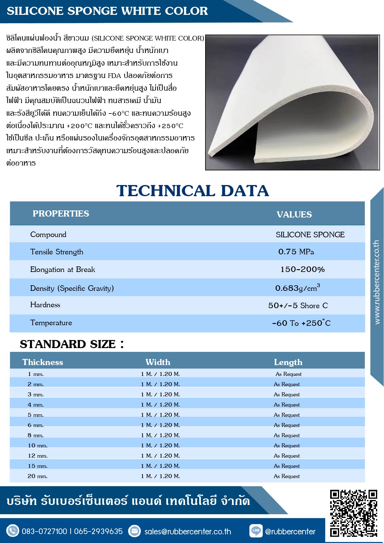 ซิลิโคนแผ่นฟองน้ำ สีขาวนม (White Silicone Sponge Sheet) ผลิตจากซิลิโคนคุณภาพสูง มีความยืดหยุ่น น้ำหนักเบา และมีความทนทานต่ออุณหภูมิสูง เหมาะสำหรับการใช้งานในอุตสาหกรรมอาหาร มาตรฐาน FDA ปลอดภัยต่อการสัมผัสอาหารโดยตรง น้ำหนักเบาและยืดหยุ่นสูง ทนสารเคมี น้ำมัน และรังสียูวีได้ดี ทนความเย็นได้ถึง -60°C และทนความร้อนสูงต่อเนื่องได้ประมาณ +200°C และทนได้ชั่วคราวถึง +250°C